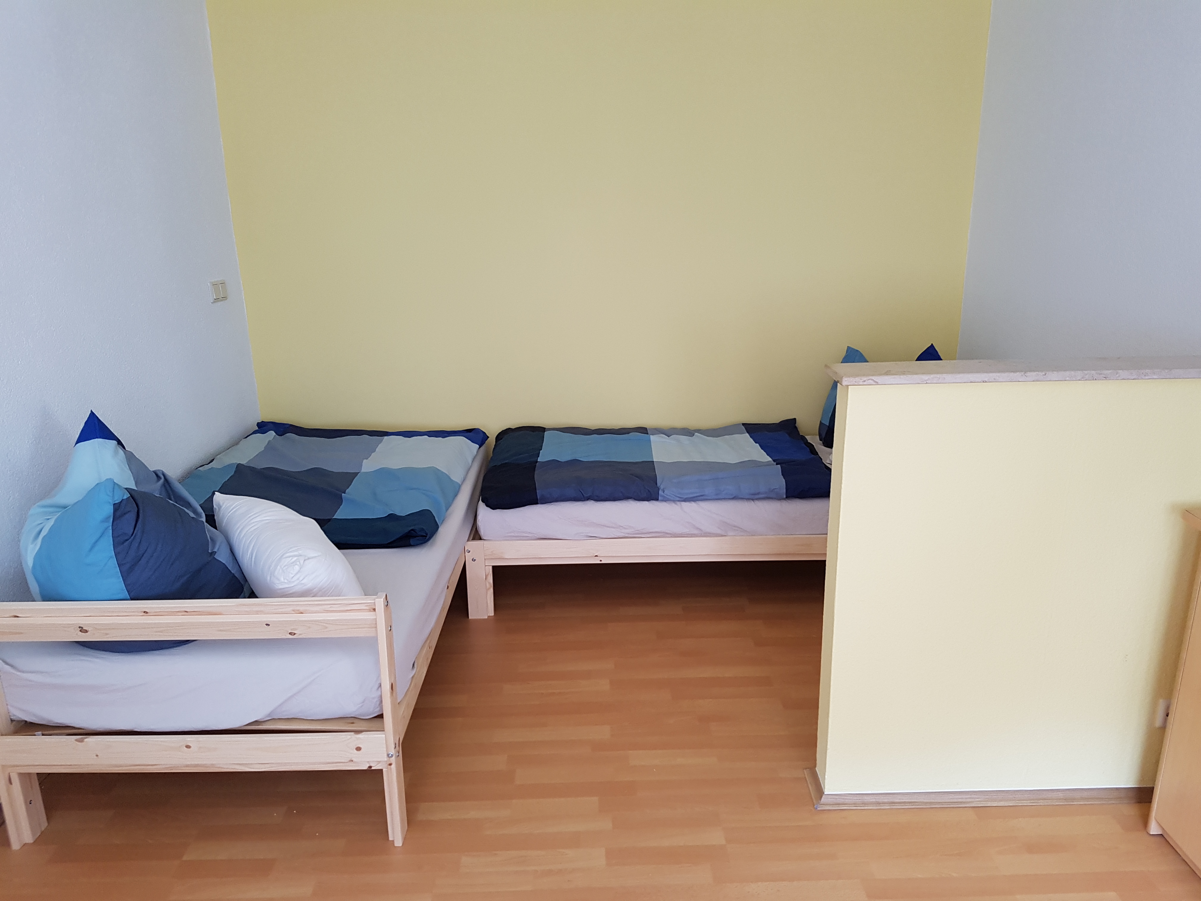 Kochfeld. Das Wohn-Schlafzimmer ist mit 2 Einzelbetten, einem