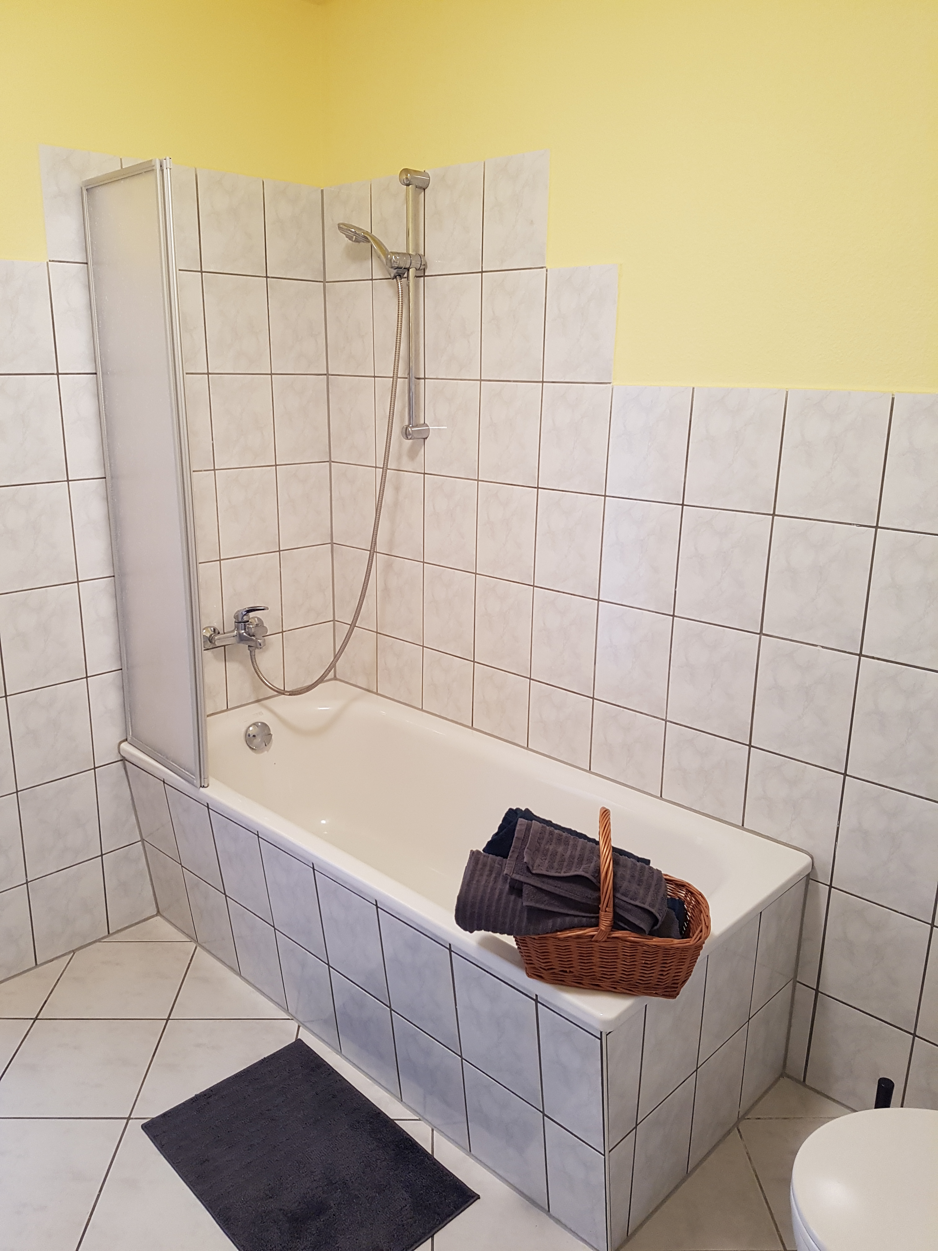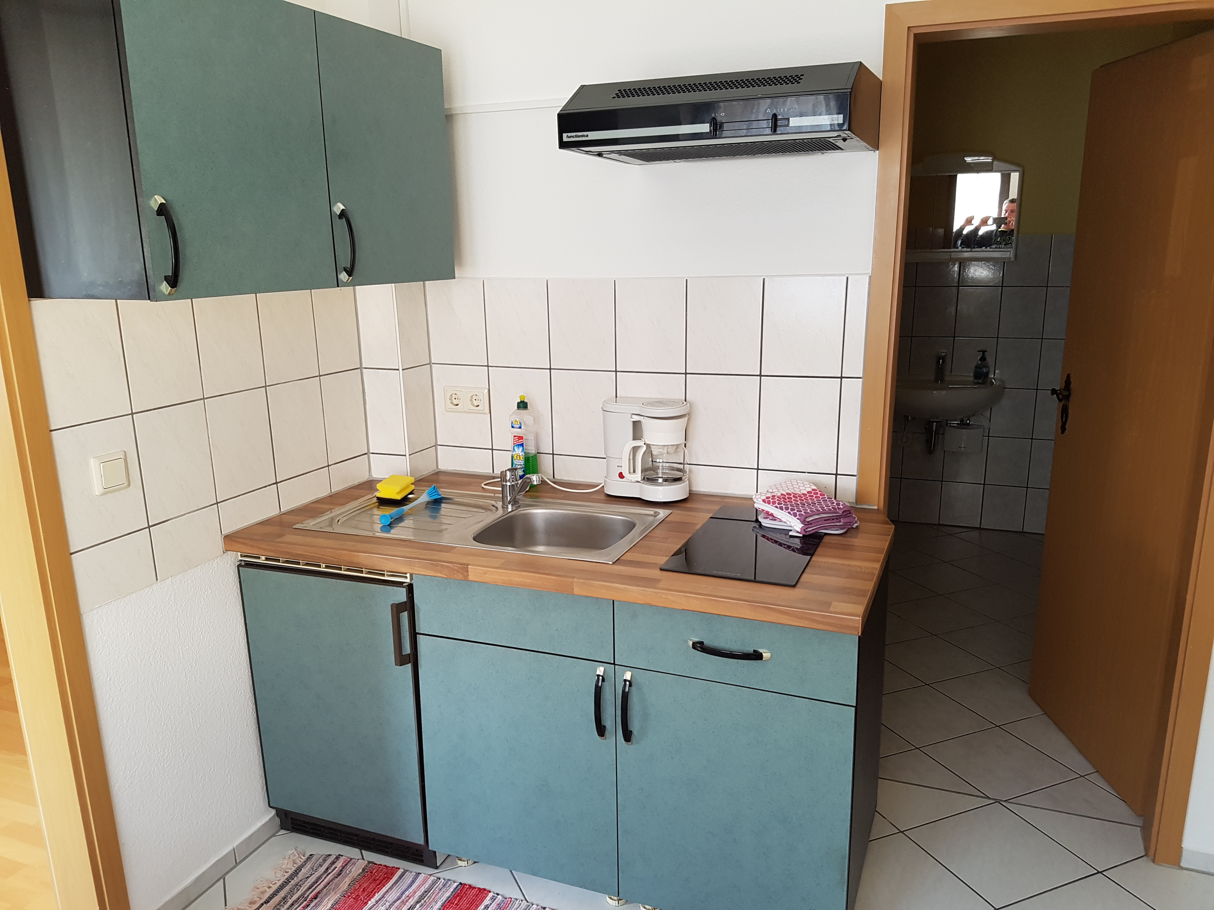 über ein Bad mit Wanne, eine kleine Küche mit